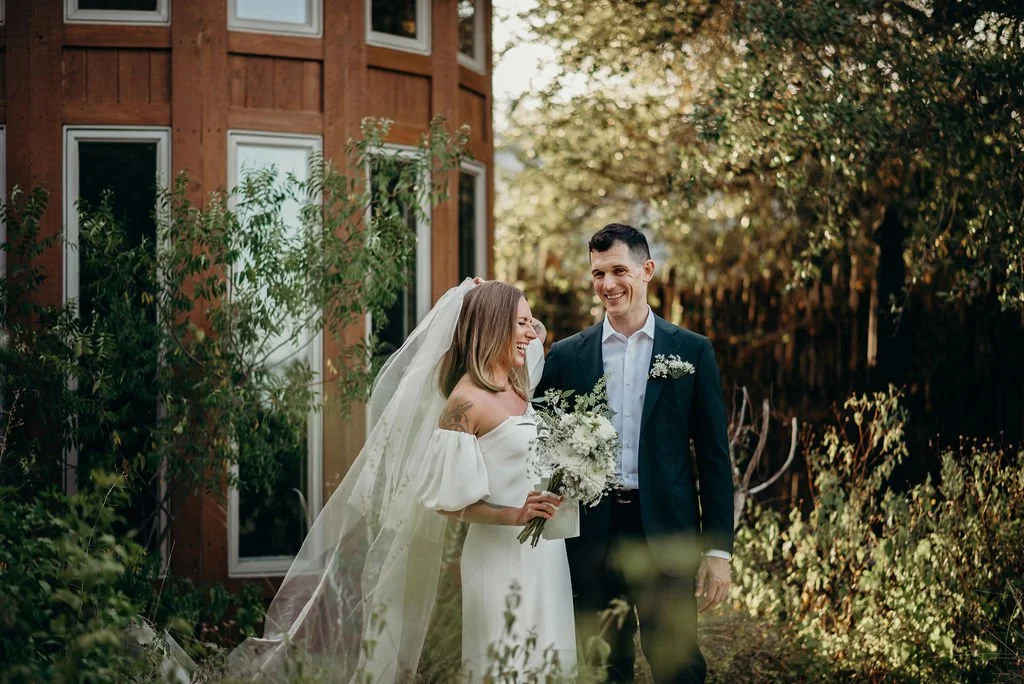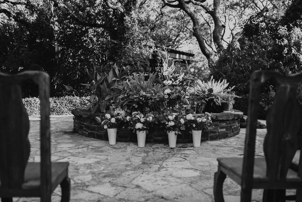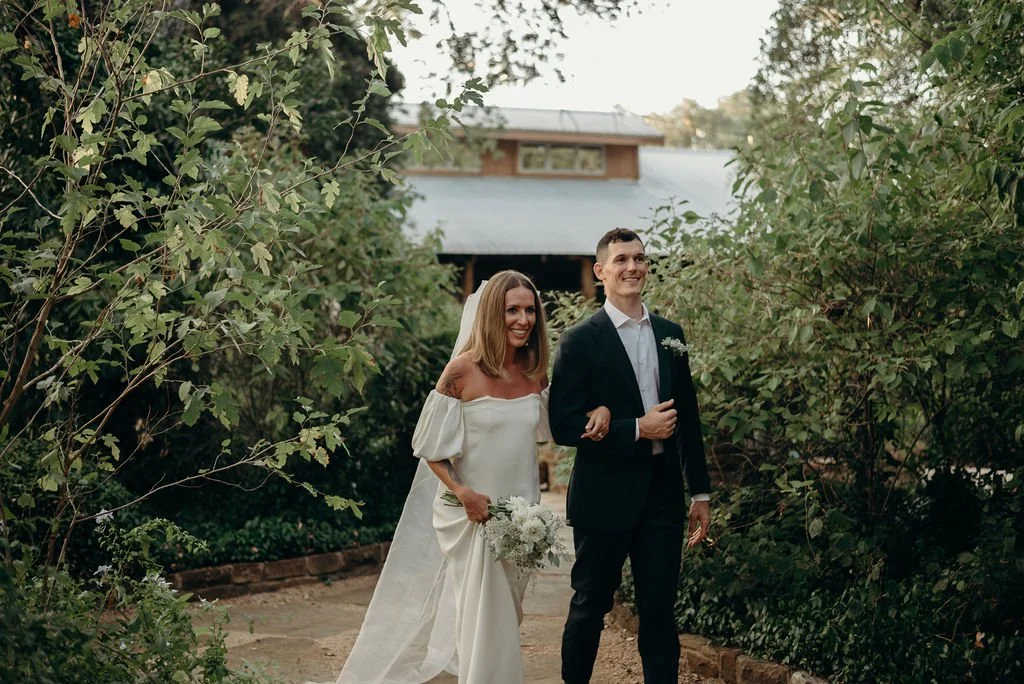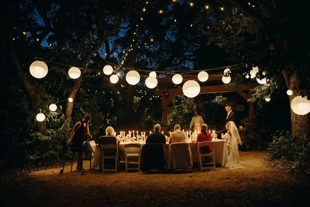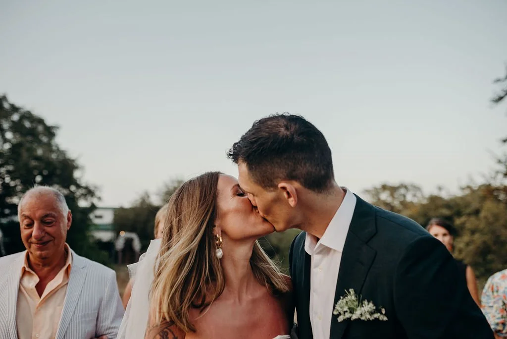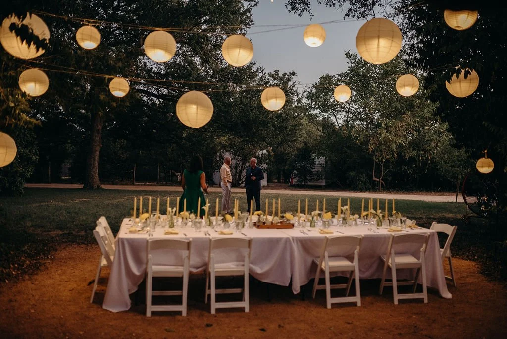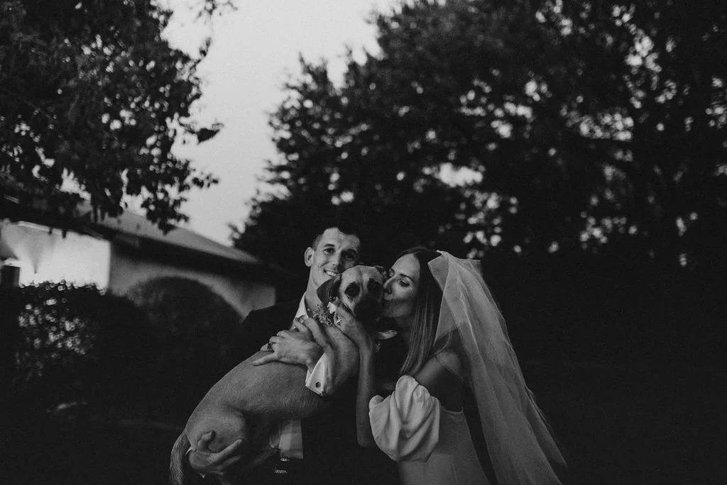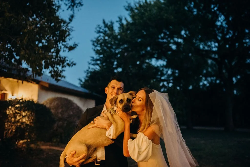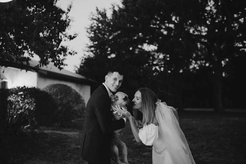 Kathryn and Oliver were married in August 2020 in an intimate outdoor ceremony surrounded by their closest friends and family. They exchanged vows in the Courtyard, embraced by lush greenery and the gentle sound of a bubbling fountain in the background. Following the ceremony, guests gathered for an outdoor catered dinner at the Promenade near the Pergola, where warm string lights created a soft, romantic glow. The couple captured portraits with their families in the surrounding meadows and fields, adding to the natural charm of the day. It was a heartfelt, sweet celebration made even more special with their dog by their side.