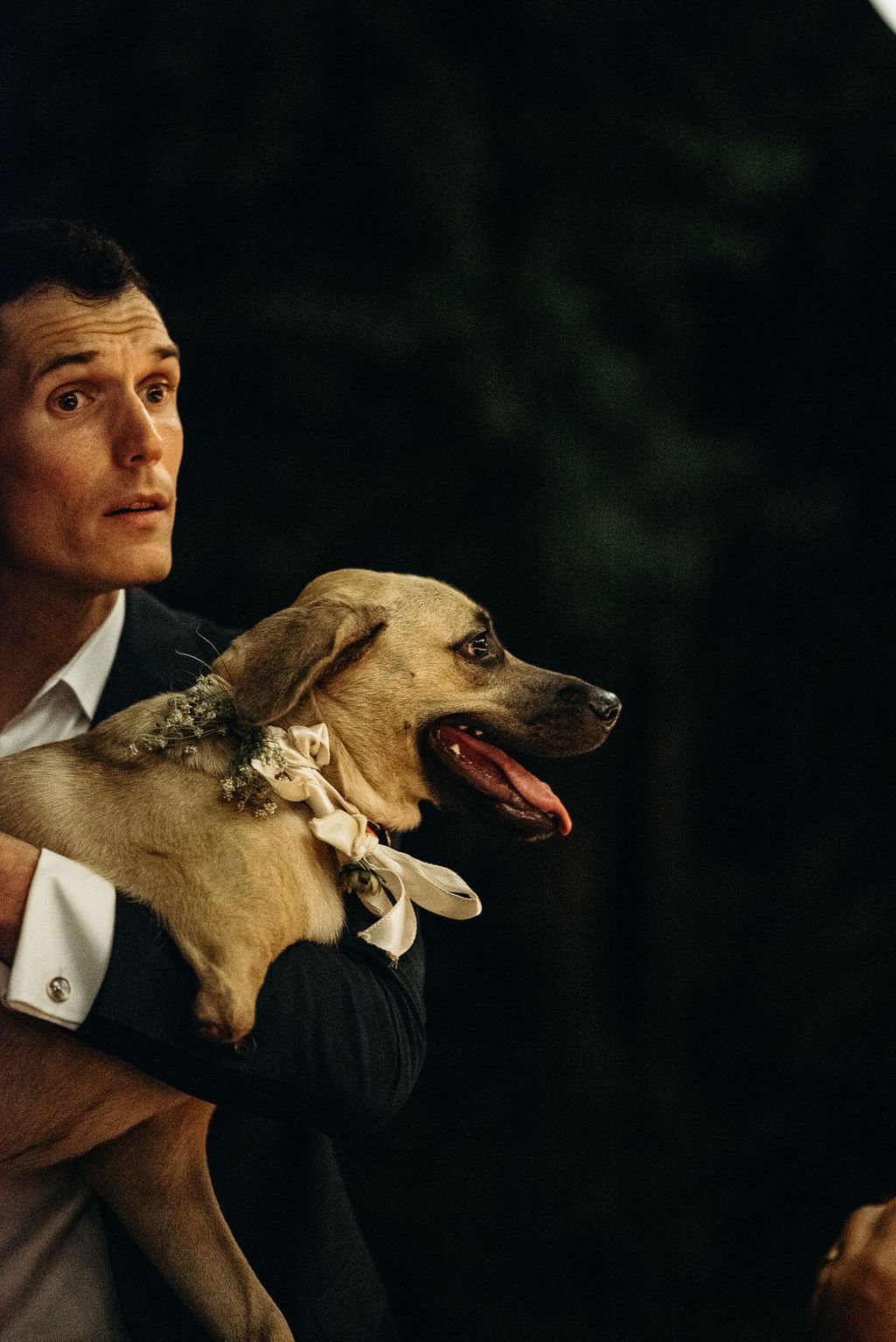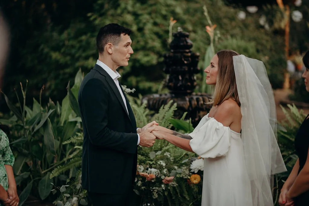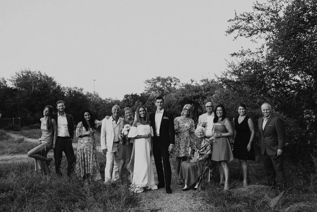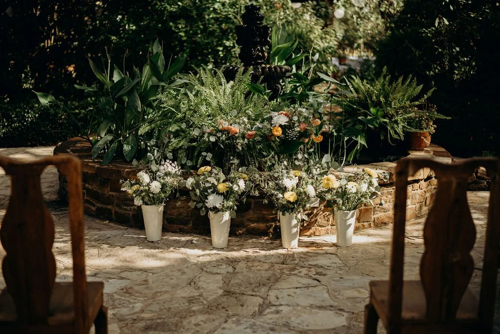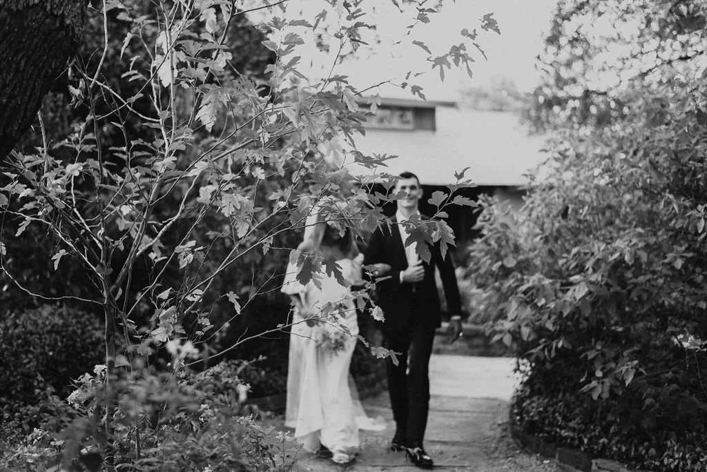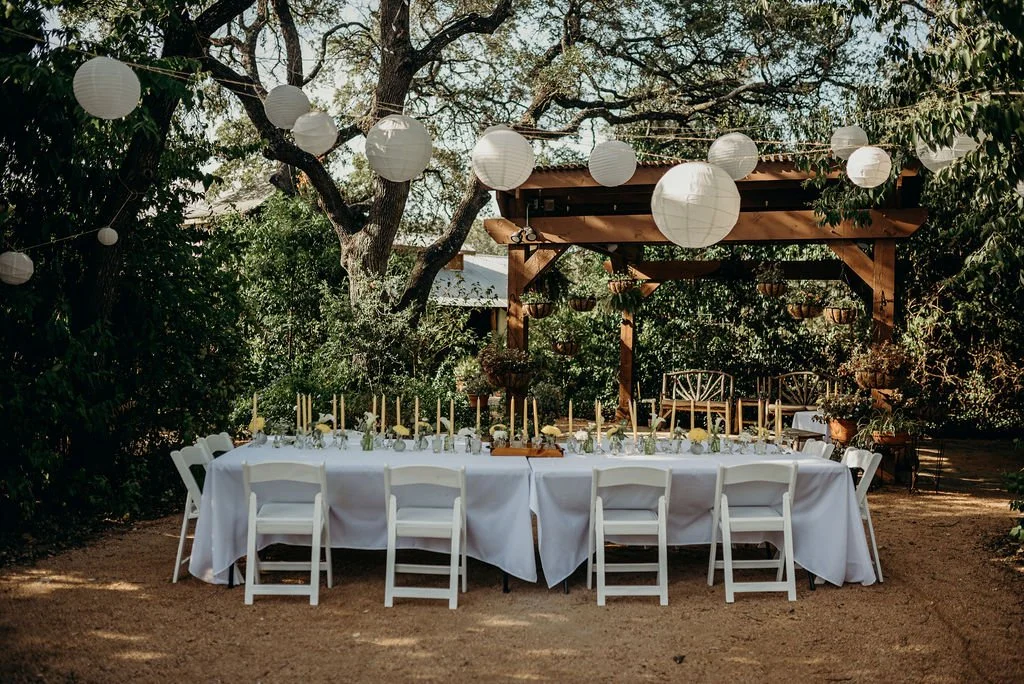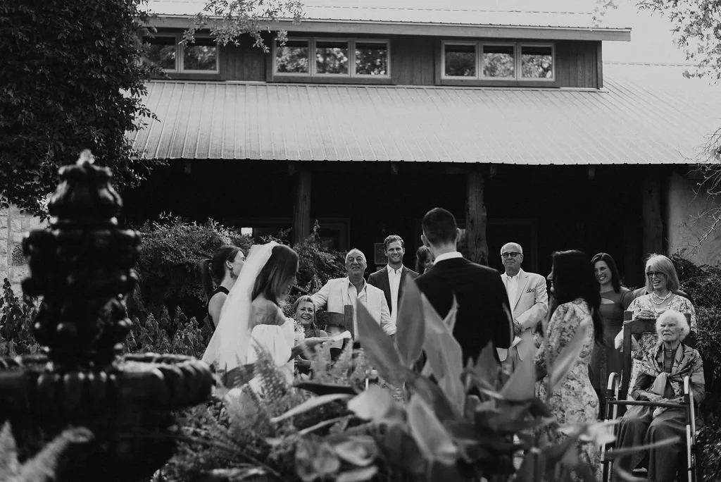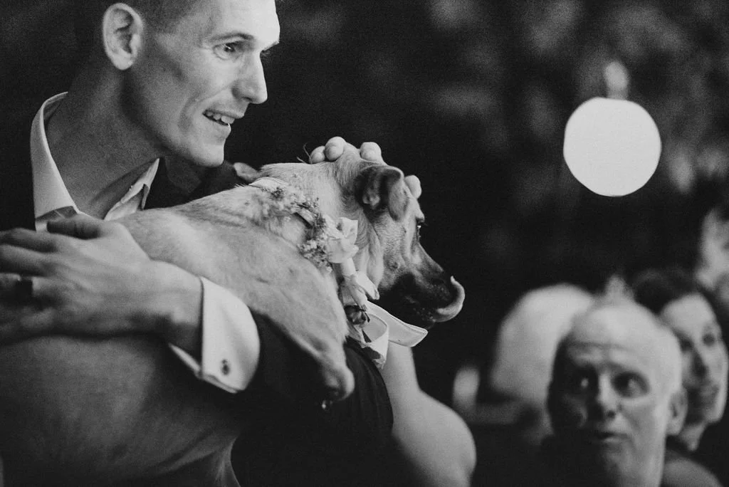 Kathryn and Oliver were married in August 2020 in an intimate outdoor ceremony surrounded by their closest friends and family. They exchanged vows in the Courtyard, embraced by lush greenery and the gentle sound of a bubbling fountain in the background. Following the ceremony, guests gathered for an outdoor catered dinner at the Promenade near the Pergola, where warm string lights created a soft, romantic glow. The couple captured portraits with their families in the surrounding meadows and fields, adding to the natural charm of the day. It was a heartfelt, sweet celebration made even more special with their dog by their side.