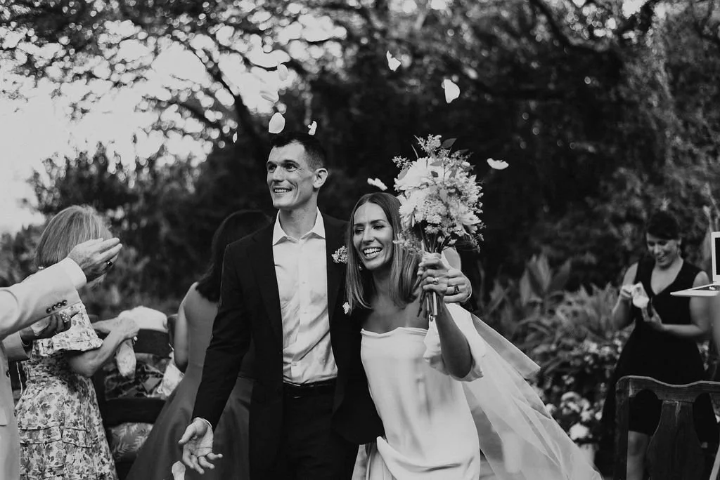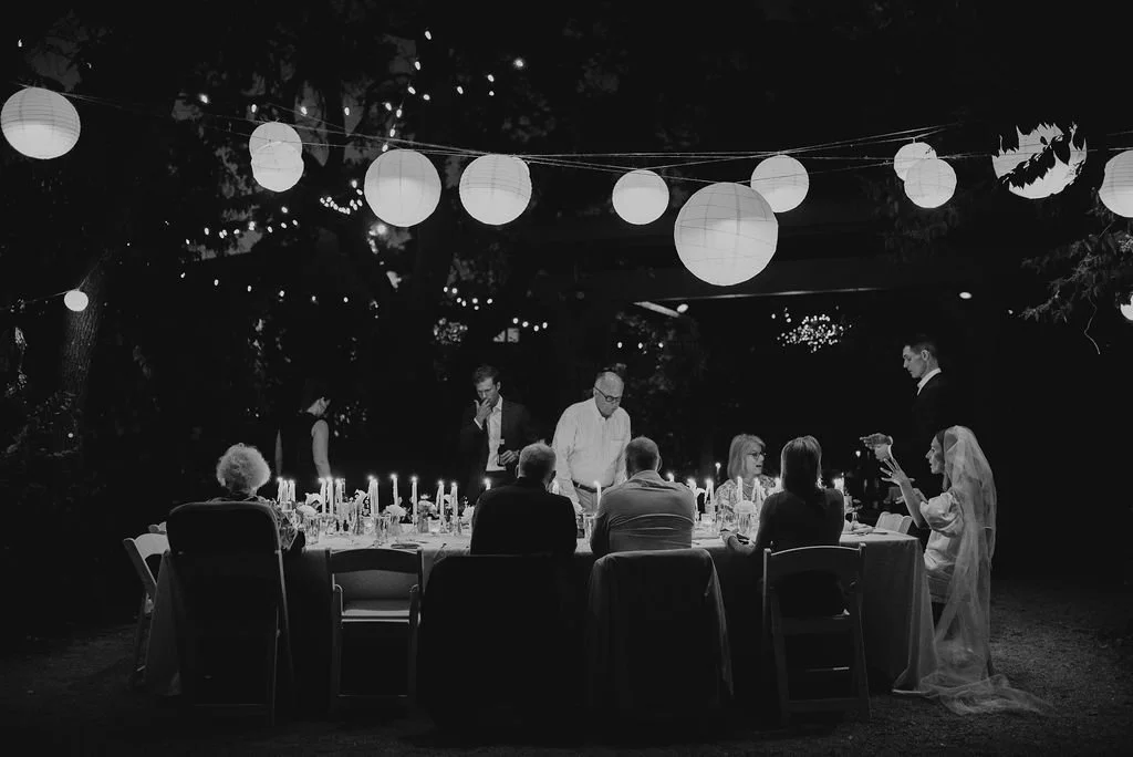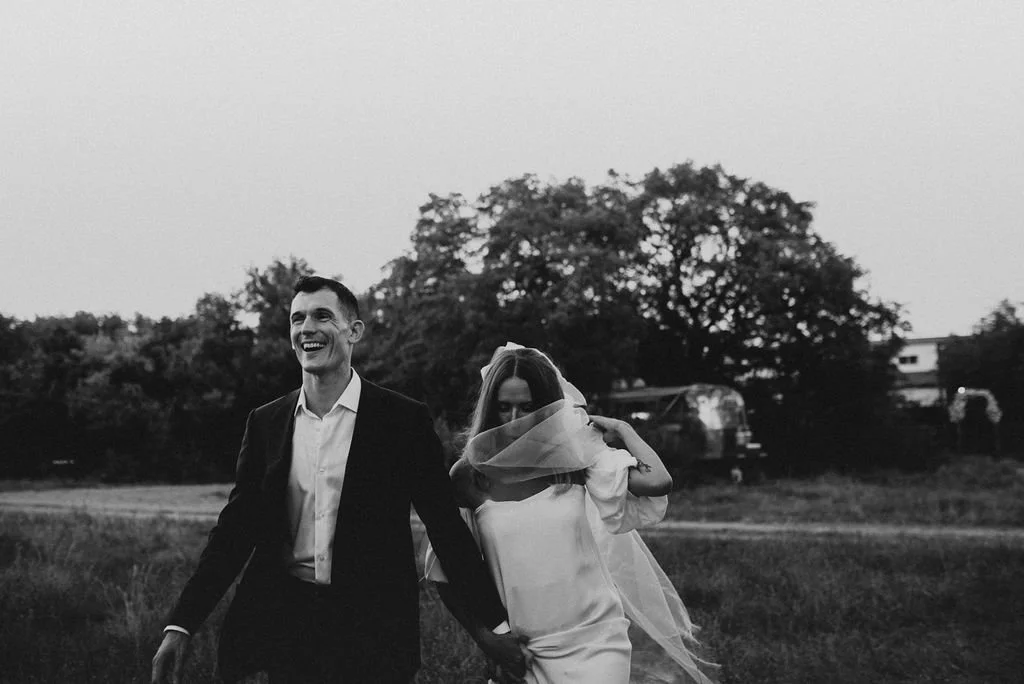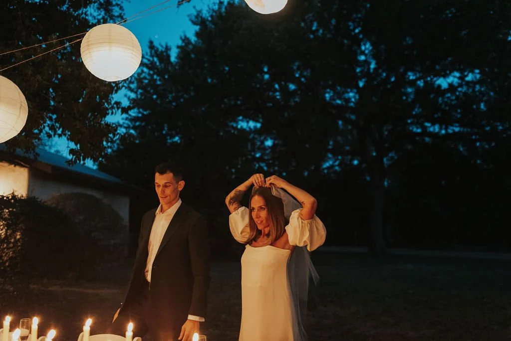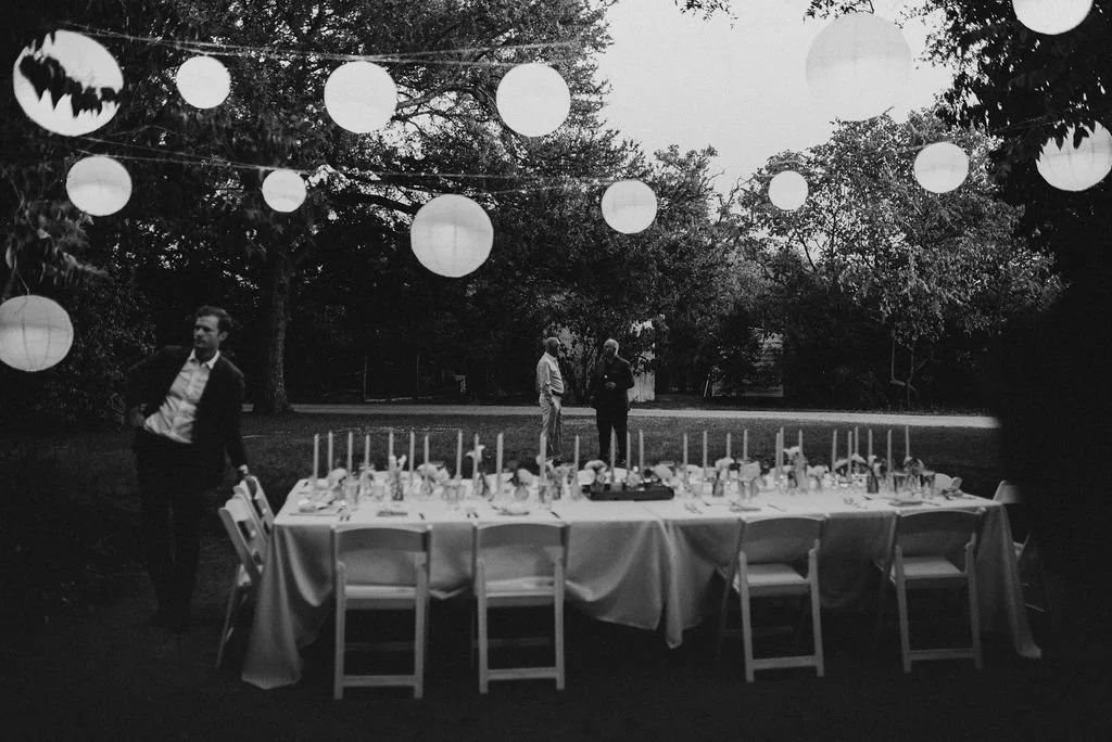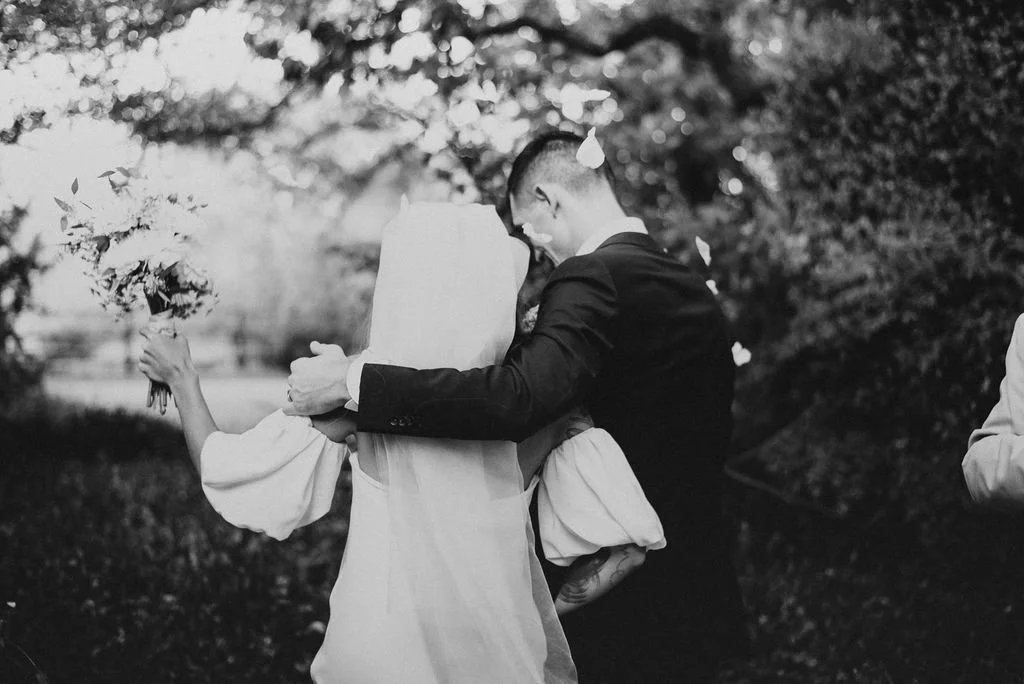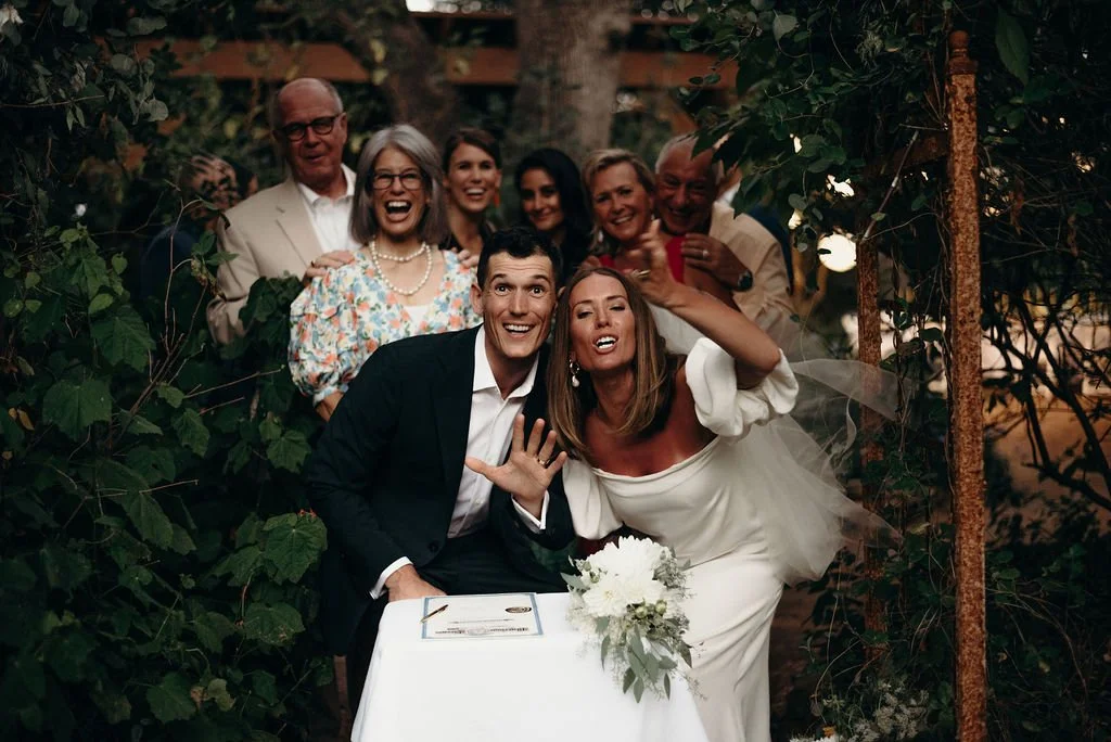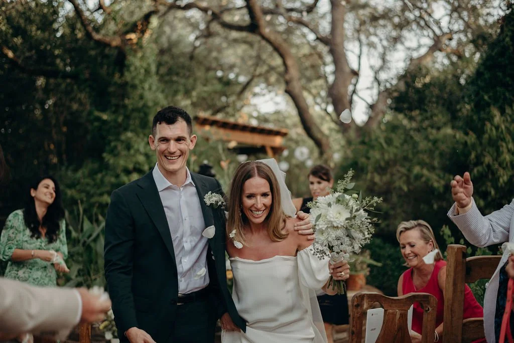 Kathryn and Oliver were married in August 2020 in an intimate outdoor ceremony surrounded by their closest friends and family. They exchanged vows in the Courtyard, embraced by lush greenery and the gentle sound of a bubbling fountain in the background. Following the ceremony, guests gathered for an outdoor catered dinner at the Promenade near the Pergola, where warm string lights created a soft, romantic glow. The couple captured portraits with their families in the surrounding meadows and fields, adding to the natural charm of the day. It was a heartfelt, sweet celebration made even more special with their dog by their side.