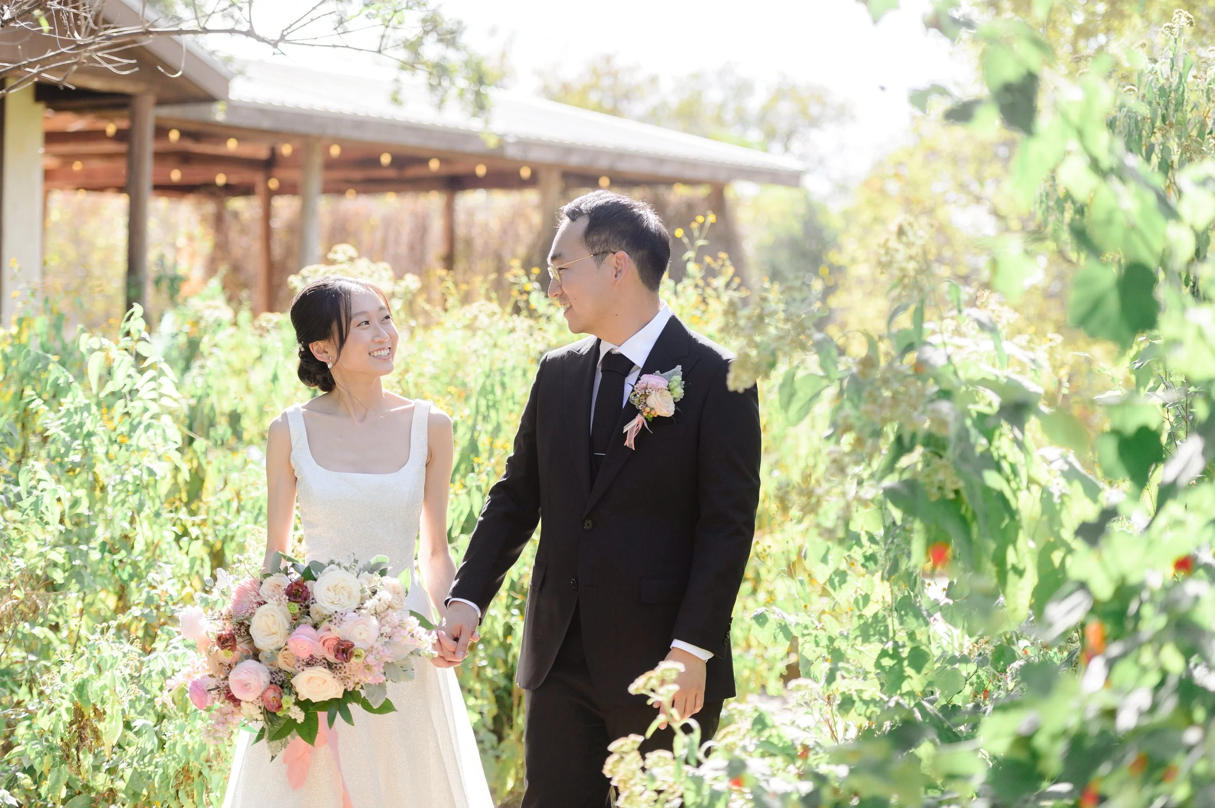 Serena and David celebrated their love on a beautiful, sunny day at the ranch. After capturing stunning portraits among the lush greenery in the courtyard, they made their way to the pergola to exchange vows. The celebration continued at the Hideout with an intimate reception, followed by dancing under the stars beneath glowing string lights.
