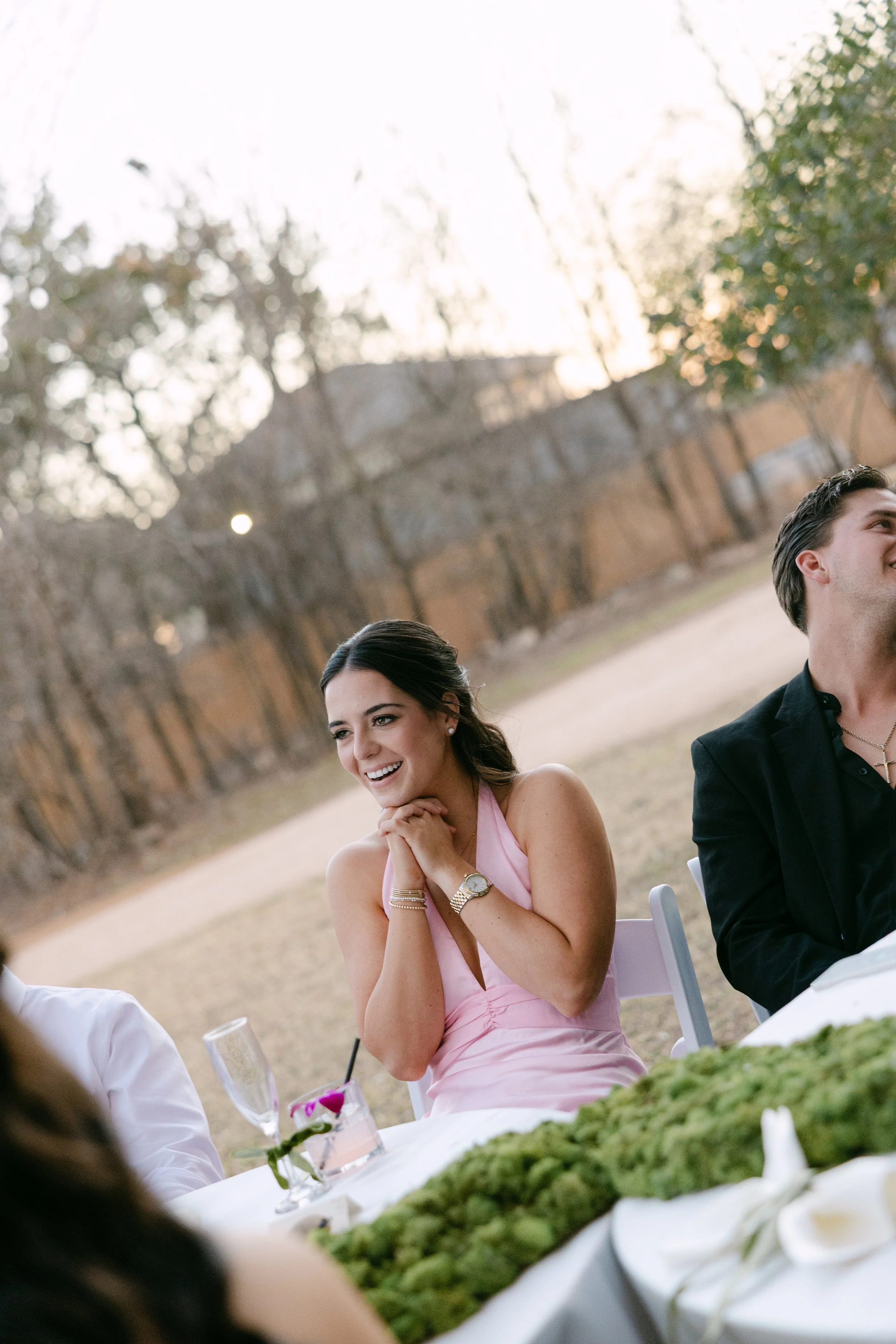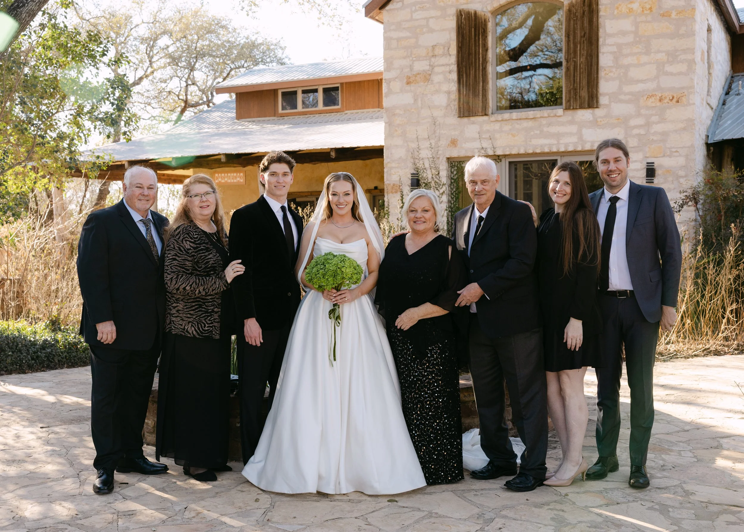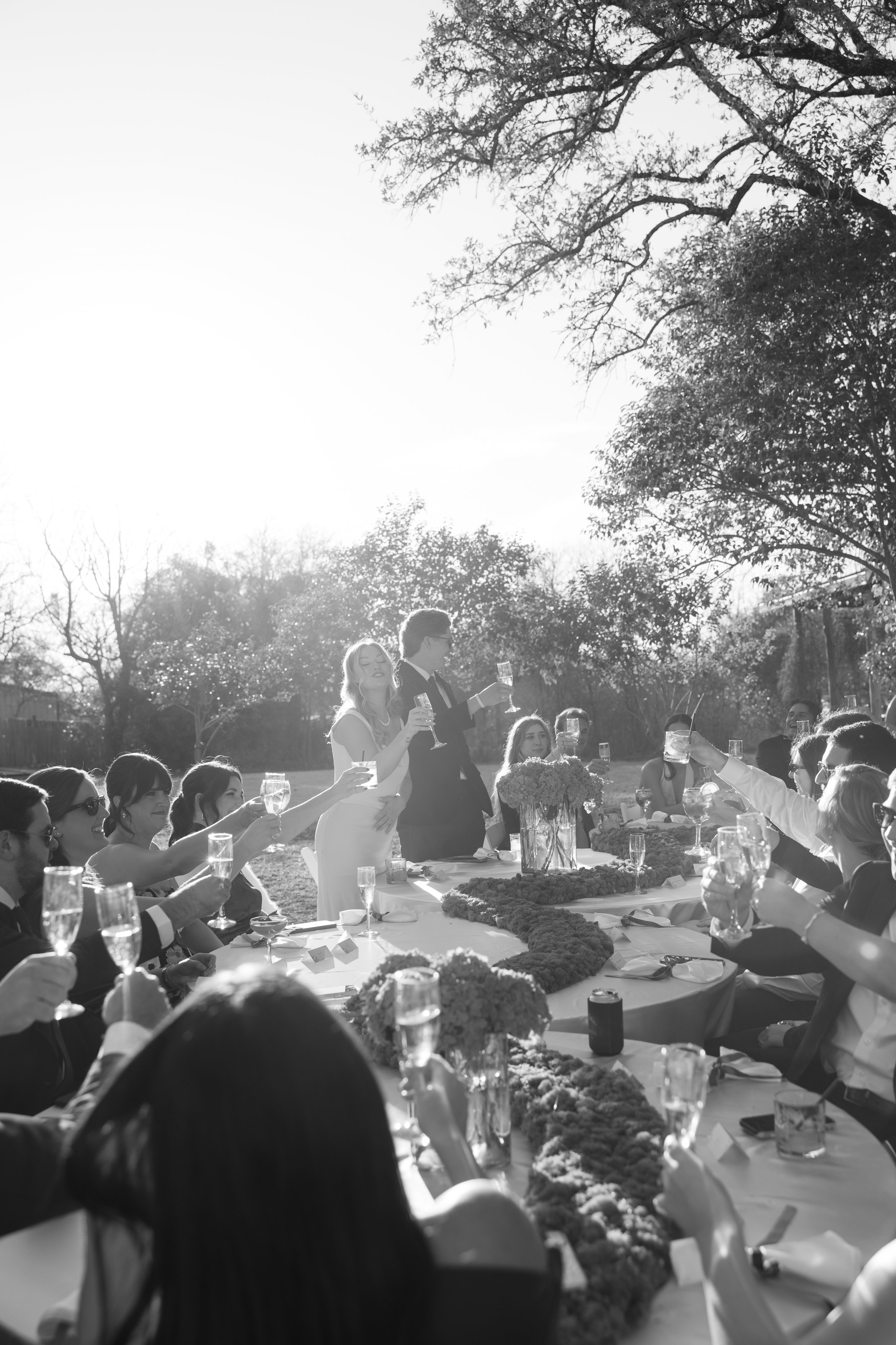 Kylie and Gunner celebrated their February 2026 wedding with a beautifully intimate weekend at Hudson Bend Ranch. The festivities began the night before with a rehearsal dinner set beneath the pergola, where they hosted a cozy dinner party with their closest guests.