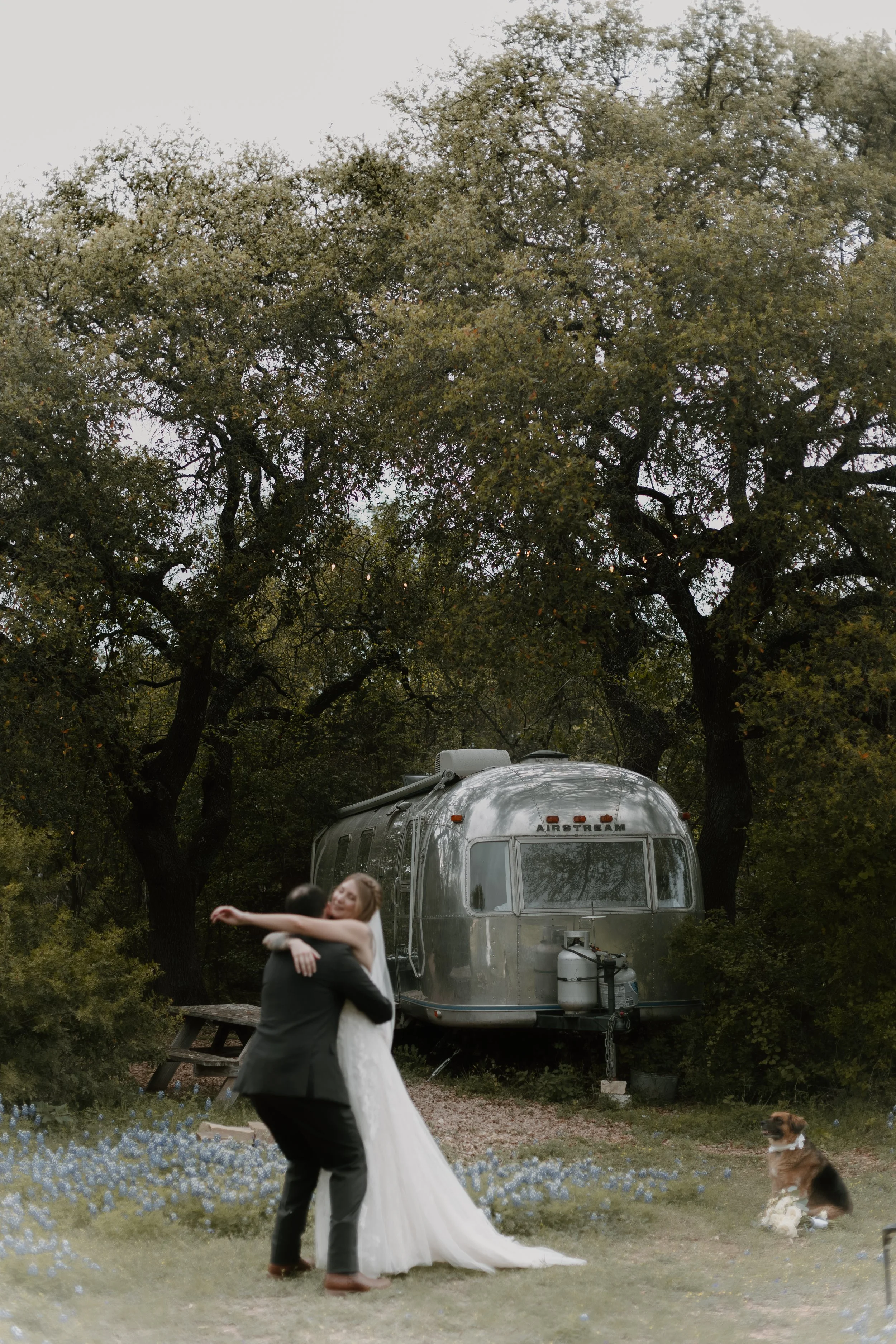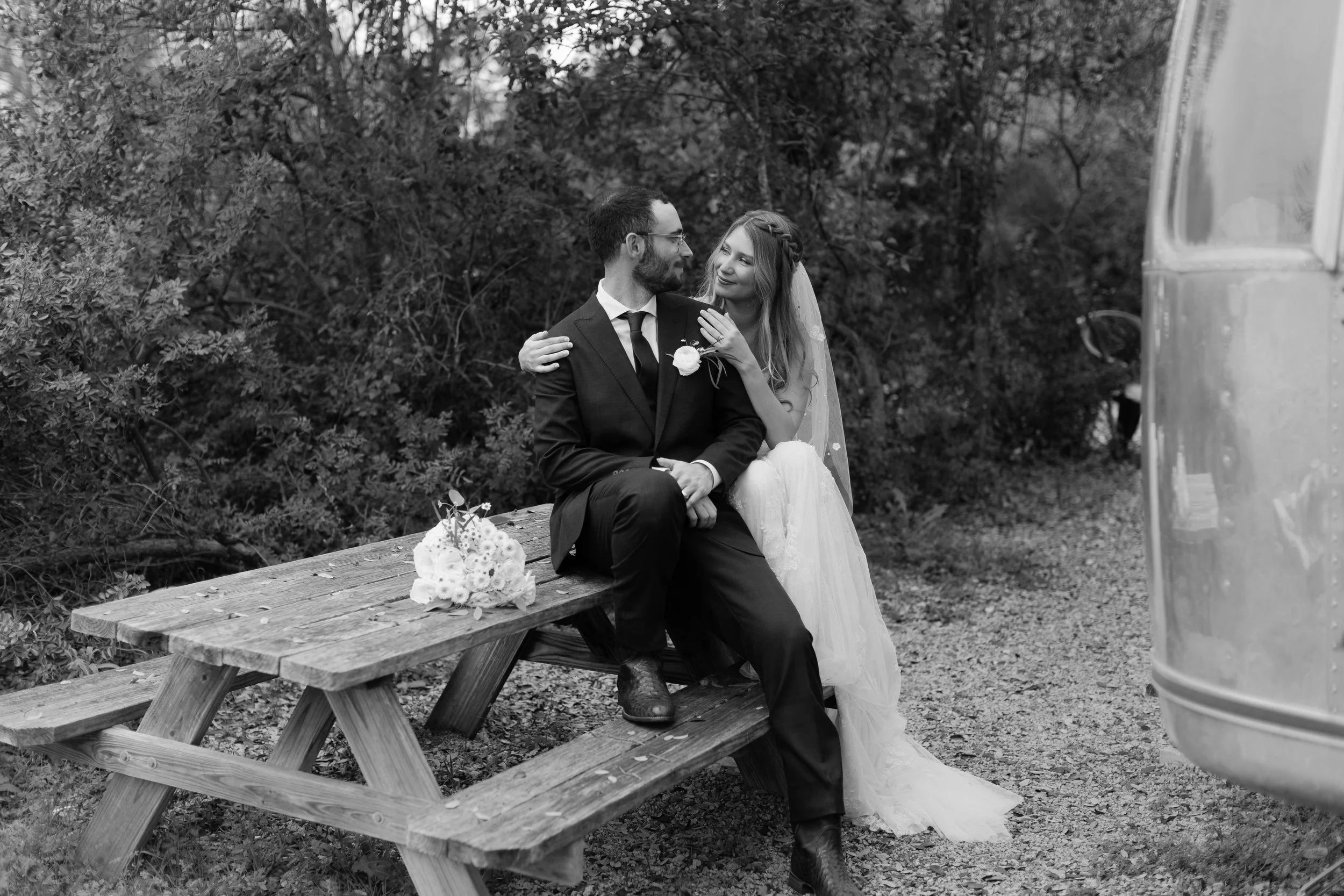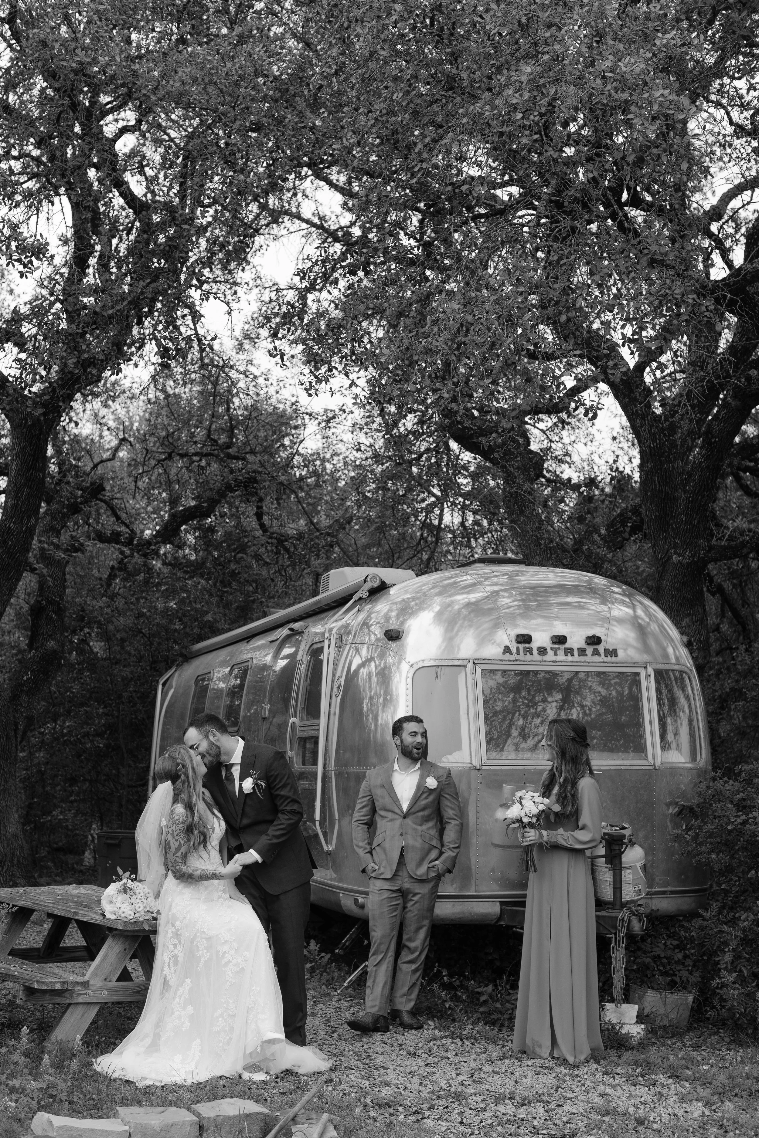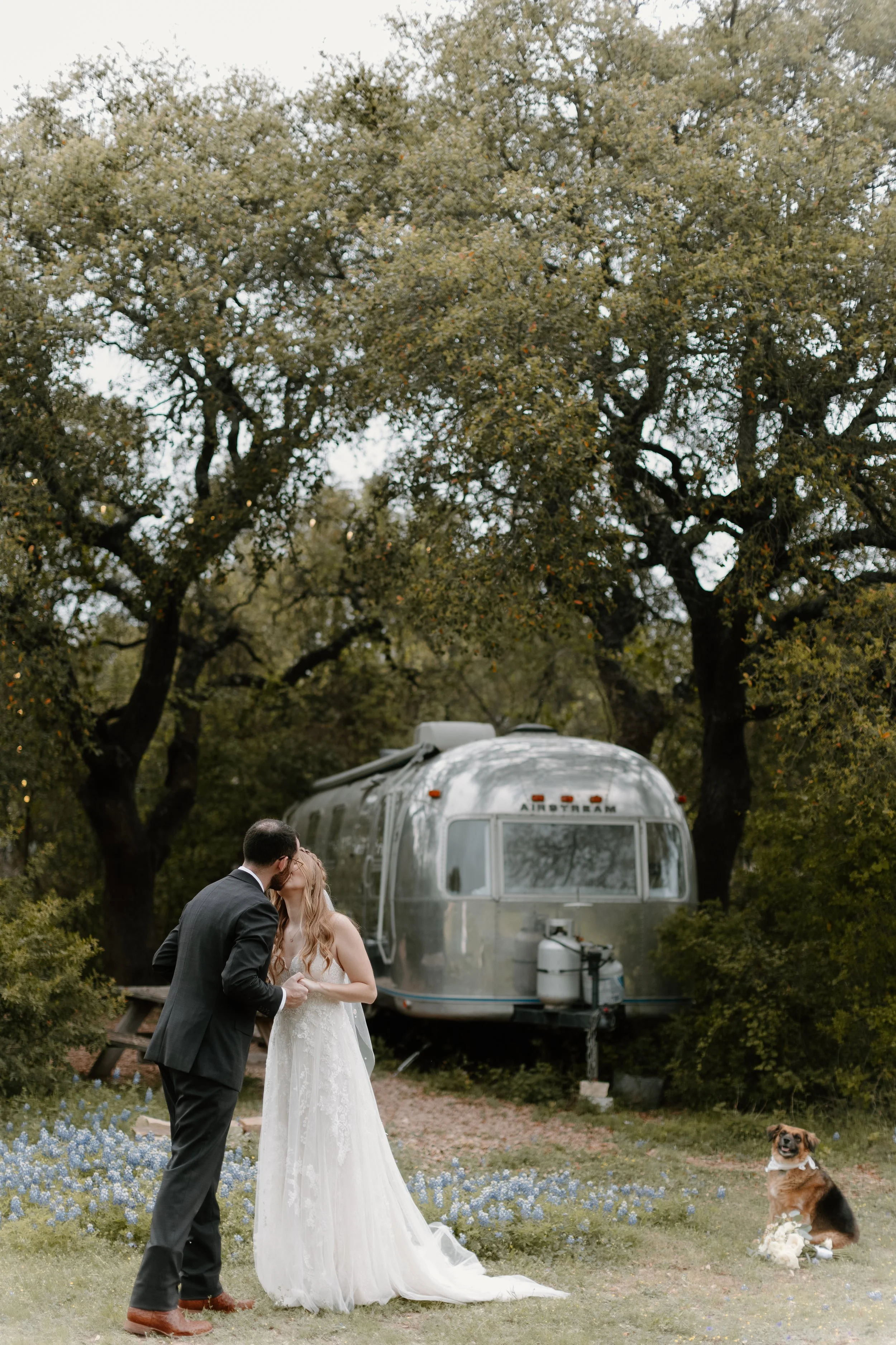 Penny and Alex tied the knot in March 2024, with their beloved dog playing a special role in the celebration. They captured heartfelt photos with their family and pup throughout the property, including some in front of the iconic Airstream trailers. Their intimate, heartfelt ceremony took place at the Pergola, followed by a lively celebration at the Hideout with their closest loved ones, dog included, of course.